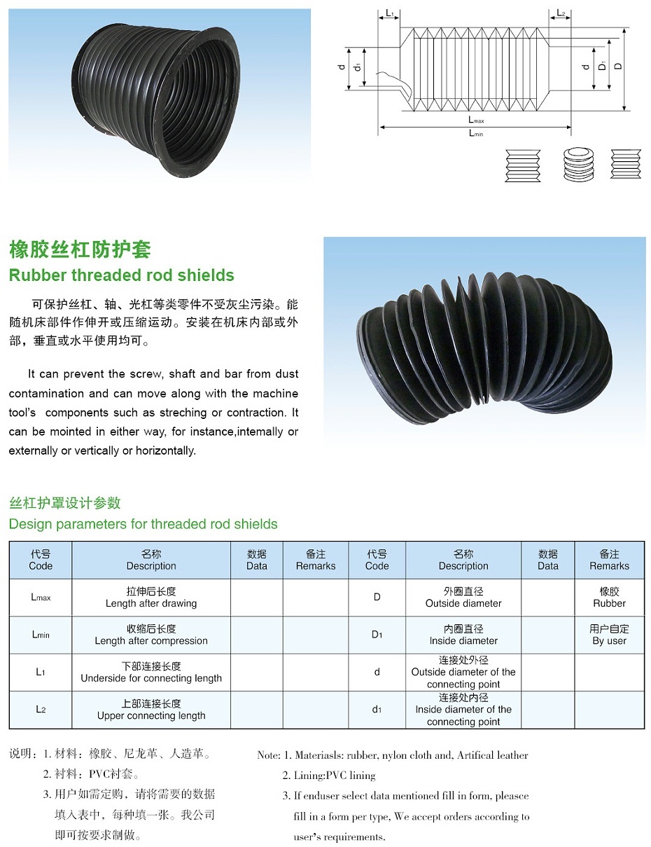 能够随部件做伸开或压缩运动,垂直或水平使用均可。水平位置时使用塑料或铝的支撑环,保持护罩内腔与丝杆之间有均匀的距离,延长使用寿命。拉伸长度大时每个折中加上金属环,提高护罩的稳定性。连接或固定端使用金属法兰盘,或选择套箍式。