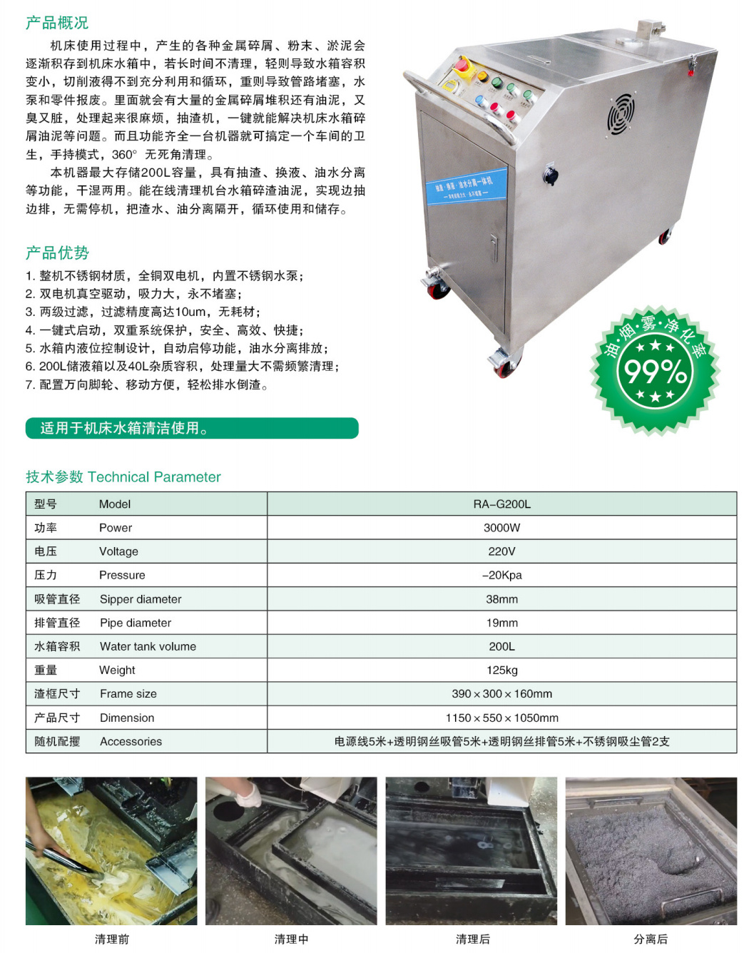 机床使用过程中,产生的各种金属碎屑、粉末、淤泥会逐渐积存到机床水箱中,若长时间不清理,轻则导致水箱容积变小,切削液得不到充分利用和循环,重则导致管路堵塞,水泵和零件报废。里面就会有大量的金属碎屑堆积还有油泥,又臭又脏,处理起来很麻烦,抽渣机,一键就能解决机床水箱碎屑油泥等问题。而且功能齐全一台机器就可搞定一个车间的卫生,手持模式,360°无死角清理。